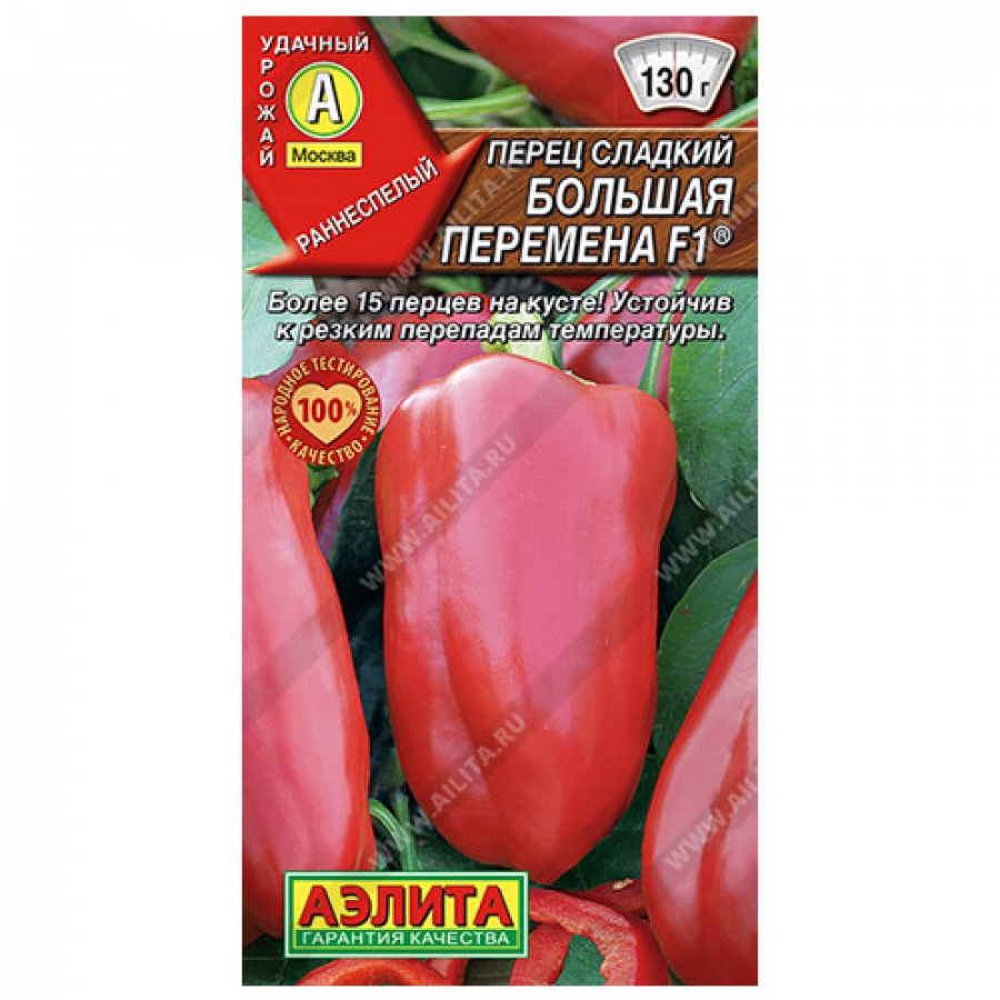 Современный раннеспелый гибрид. Собирать плоды начинают через 110-115 дней после всходов. В средней полосе рекомендуется для пленочных укрытий, в южных регионах – для открытого грунта. Растения полуштамбовые, высотой 70-80 см, с хорошей нагрузкой урожаем: на каждом кусте одновременно формируется более 15 плодов. Перцы массой 100-130 г, с толстыми, сочными стенками толщиной 5-7 мм. Замечательный вкус и приятный аромат делают его фаворитом в свежих салатах. А благодаря высокой урожайности (6-9 кг/м², при хорошей агротехники – до 12 кг/м²), плодов с лихвой хватит и для домашней кулинарии и для зимних заготовок.