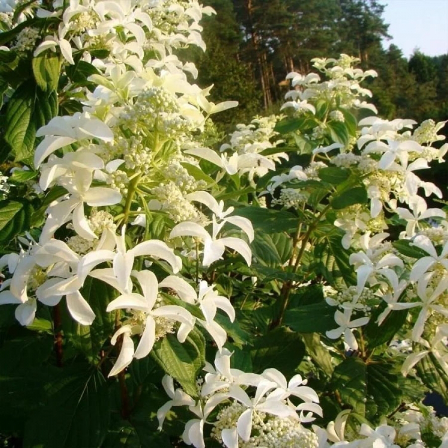 Огромные соцветия длиной до 50 см имеют форму узкой пирамидки и состоят из стерильных и фертильных цветков. Стерильные цветки крупные, в диаметре 6-8 см, белого цвета, 4-х лопастные, правильной формы с шаровидными чашелистиками. Цветки сохраняют белую окраску почти до окончания цветения, иногда лепестки в нижней части метелки могут приобретать едва заметный розоватый оттенок. Сорт имеет ощутимый сладкий аромат.