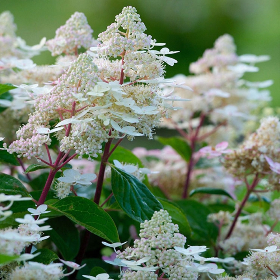 Гортензия Эрли Харри – это компактное растение высотой до 130-150 см. Побеги сильные и крепкие, прямостоячие. Они с легкостью выдерживают крупные соцветия и не требуют подвязки. Листья ярко-зеленые, продолговатые, с заостренными кончиками. Осенью они приобретают необычный лимонно-медный оттенок. Цветы четырехлепестковые, стерильные. Они собраны в крупные, немного приплюснутые соцветия округло-конусовидной формы. Они окрашены в белоснежный цвет, который постепенно становится розово-фиолетовым. Цветение гортензии очень длительное, оно продолжается с начала июля до первых дней сентября.