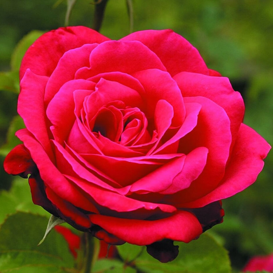 Бутоны овальные. Цветки вишнево-красные, удлиненные с острым центром, крупные (11-12 см), махровые (60 лепестков), слегка душистые, стойкие. Листья темно-зеленые, блестящие. Шипы частые. Кусты сильнорослые (80-100 см), очень густые, прямые, стройные. Цветение обильное. Зимостойкий. Устойчив к мучнистой росе. Для групп, срезки, штамбовой культуры.