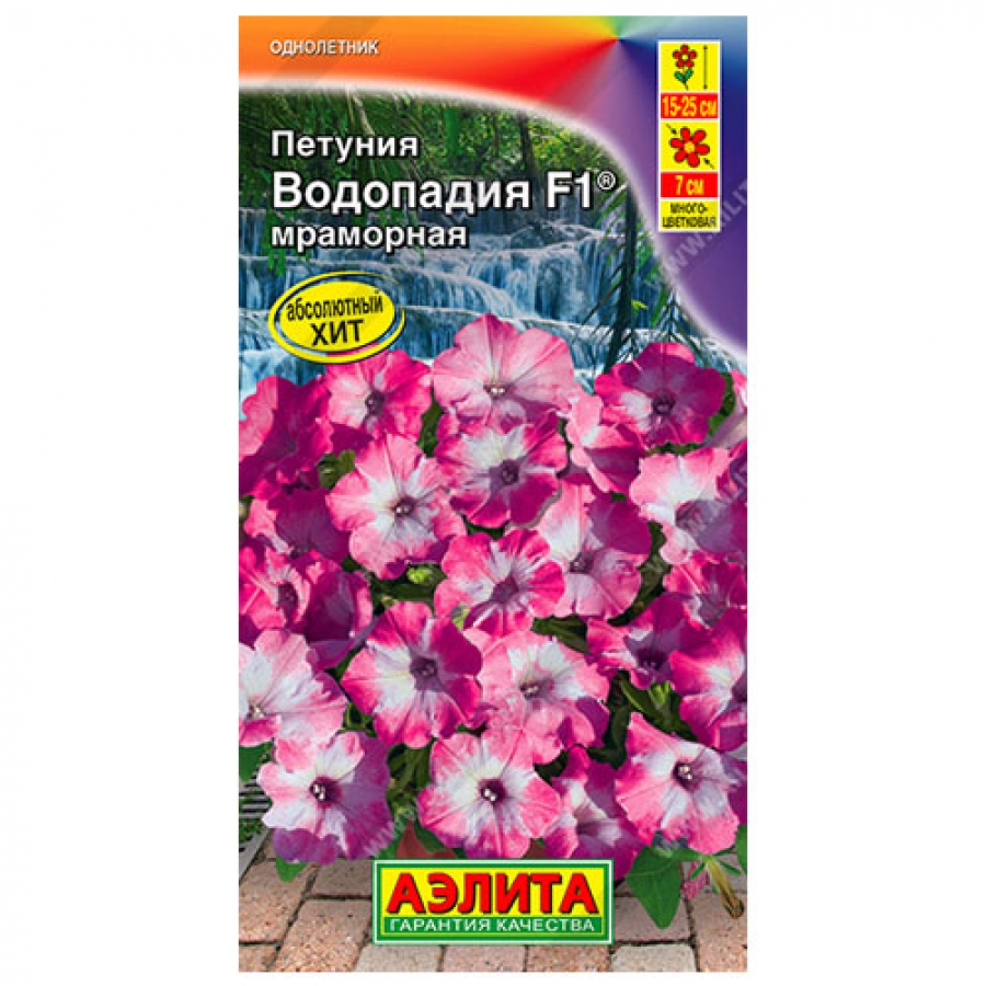Абсолютный хит! Серия многоцветковых петуний каскадного типа, которая отличается совершенно новой полуампельной формой. Уникальность этих гибридов в том, что новые цветоносные побеги образуются без прищипки в пазухах листьев в середине куста, не оставляя пустот. Растения формируют пышные кустики, высотой 15-25 см. Поникающие побеги длиной до 70 см полностью усыпаны яркими насыщенными цветками Ø 7 см и спускаются восхитительным водопадом. Гибриды устойчивы к повышенным температурам и неблагоприятным погодным условиям, однако мраморная расцветка при недостаточном освещении может изменяться. Петунии Водопадия F1 ® наилучшим образом подходят для подвесных кашпо и корзин.