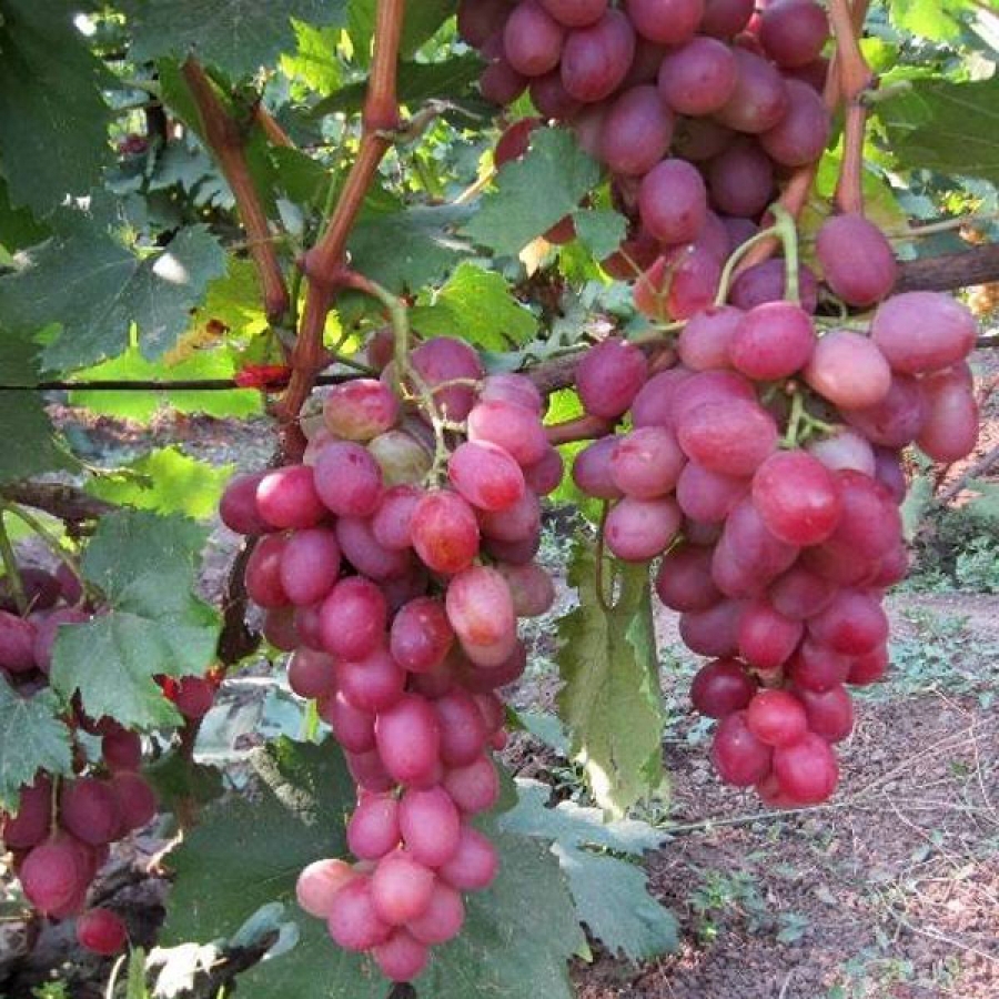 Сильнорослые кусты винограда обрастают привлекательными гроздями высокого товарного качества. В зависимости от погодных условий, на которые приходится период вызревания лозы, вес каждой кисти может достигать 700-1300 г. Ягоды у сорта винограда Анюта крупные. Овальные виноградины насыщенного темно-розового цвета достигают 15 г веса. Послевкусие плоды оставляют приятное, сравнимое с легким мускатом. Кожица хоть и плотная, но съедаемая. Мякоть с 4-мя косточками мясисто-сочная и плотная. Но горошению гибрид не подвержен. Сорт устойчив к серой гнили и оидиуму.